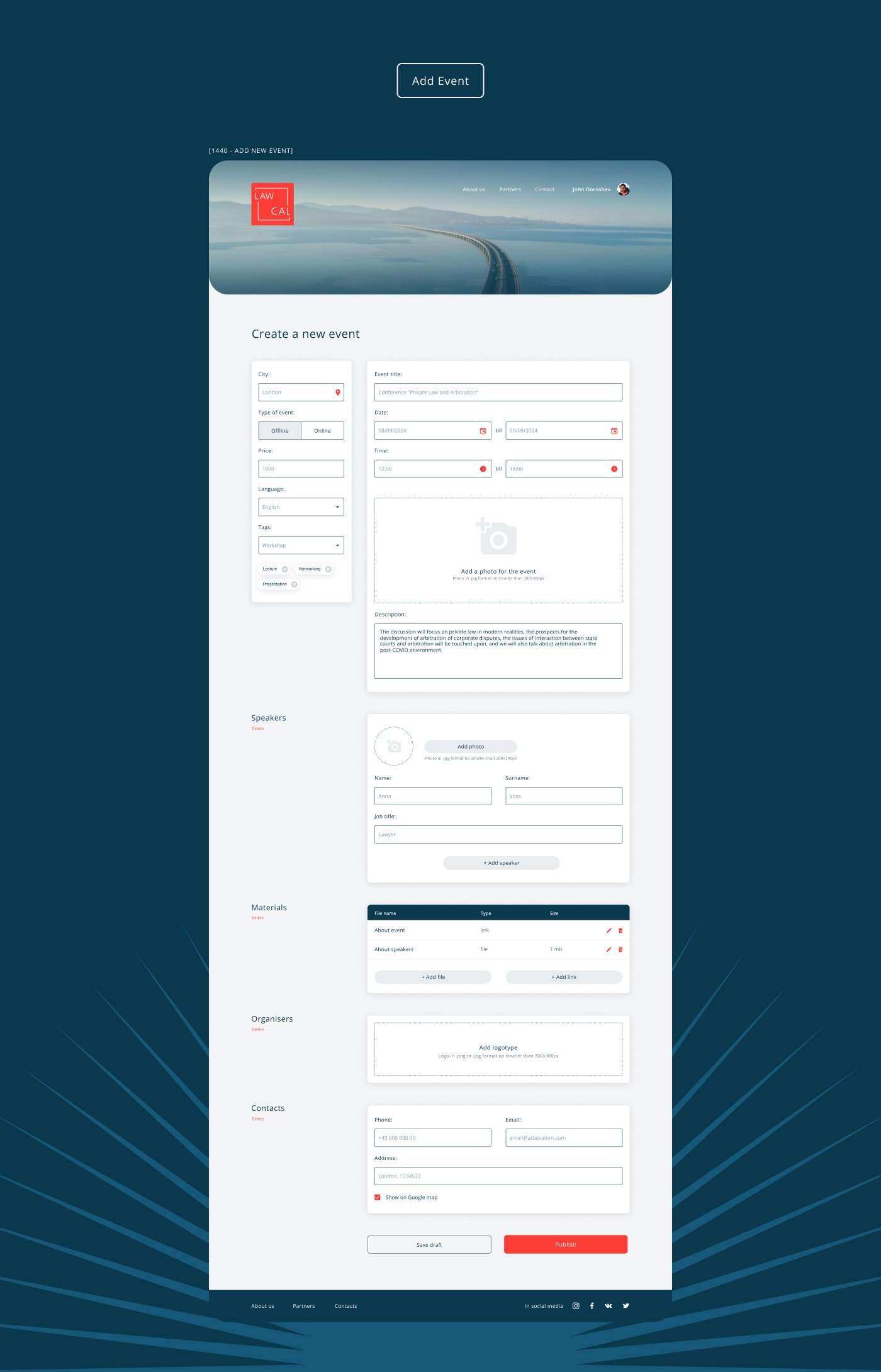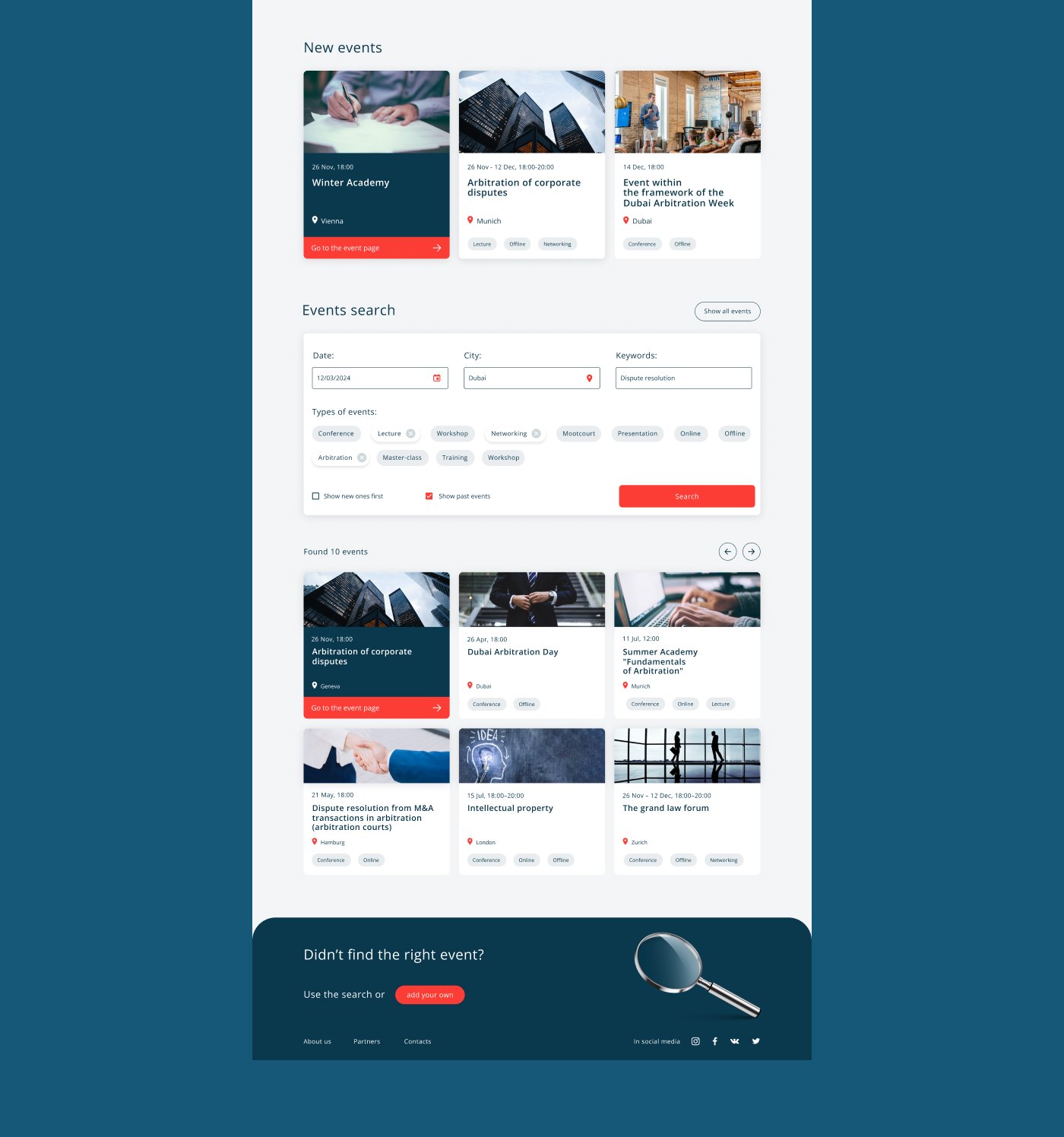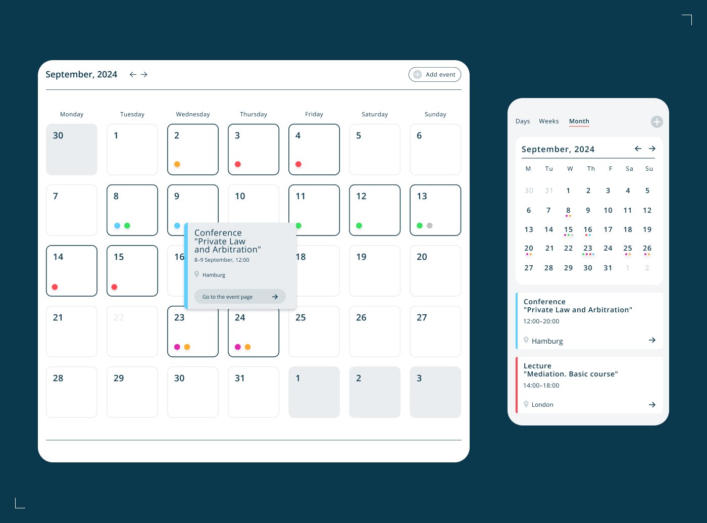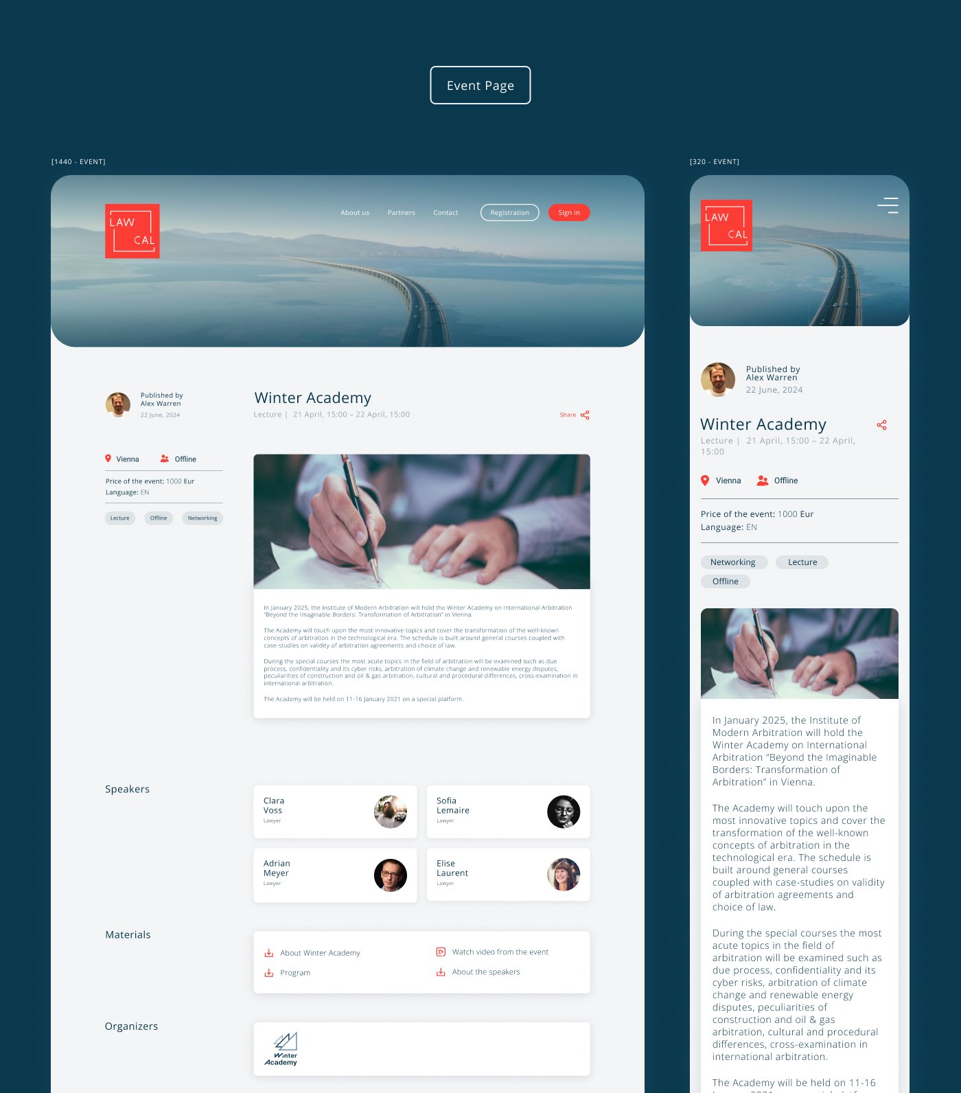 A refined blue palette was chosen to establish trust, while red accents highlight key actions, enhancing usability. The interface incorporates an interactive calendar, categorized event listings with smart filters, and personalized notification options. Additionally, clear typography and structured layouts improve readability and navigation.